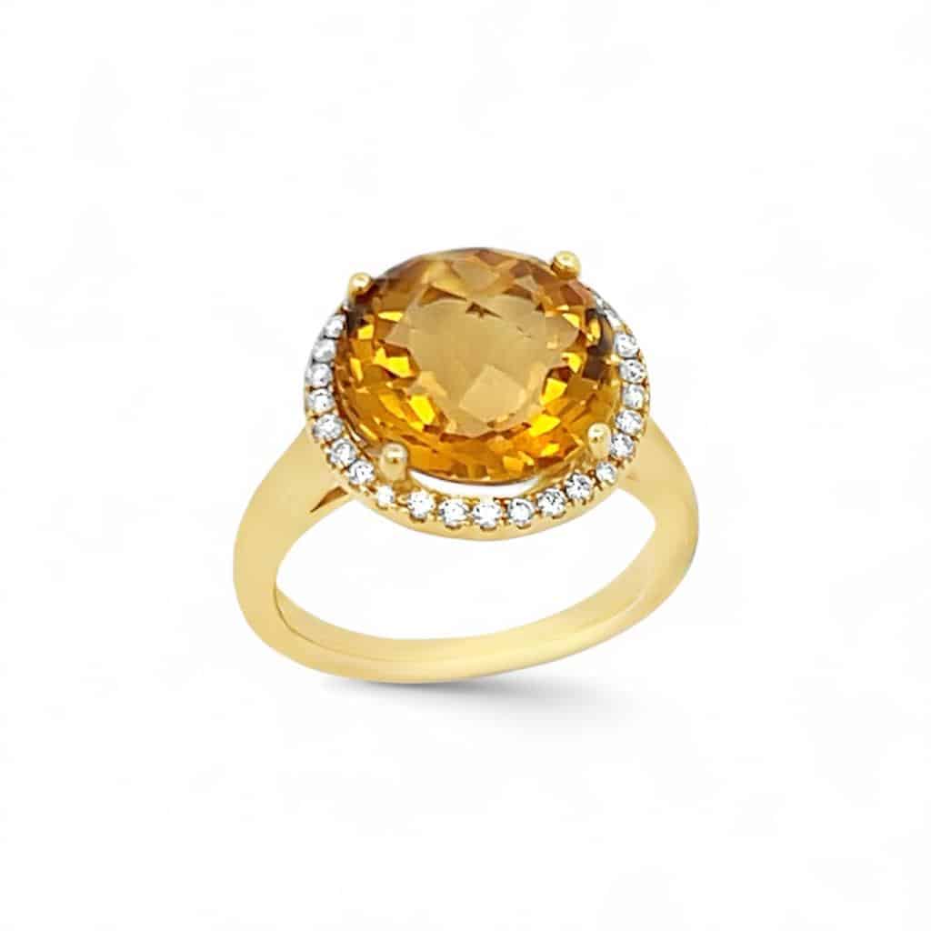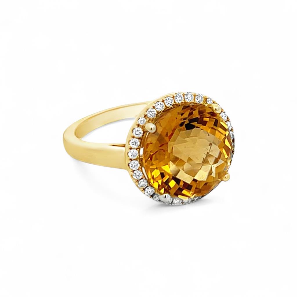 This exquisite 14kt yellow gold halo ring features a captivating round checkerboard-cut citrine, glowing with golden-orange brilliance. Encircling the vibrant center stone are 30 round diamonds, totaling 0.25 carats, each carefully set to enhance the citrine’s warmth with a halo of light. The rich hue of the yellow gold band complements the gemstone’s sunny tone, creating a harmonious and sophisticated design.