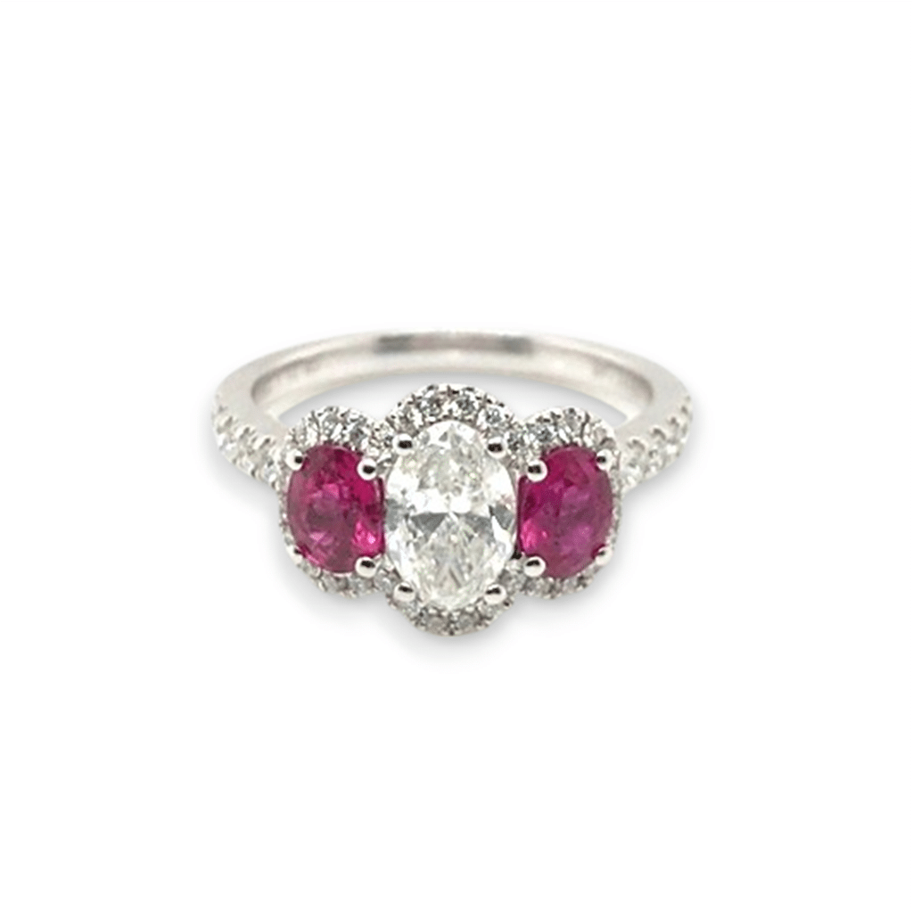 A timeless symbol of love with a vibrant twist, this 18kt white gold engagement ring features a 0.71-carat oval diamond at its center, graded G color and SI2 clarity at 10X. Flanking the center stone are two oval rubies with a combined total weight of 0.73 carats, adding a rich pop of color. Surrounding the stones and adorning the band are 42 round brilliant accent diamonds totaling 0.32 carats, enhancing the ring’s sparkle and elegance. A beautiful blend of classic design and bold detail, perfect for a truly unforgettable proposal. Ring is a size 6.5.