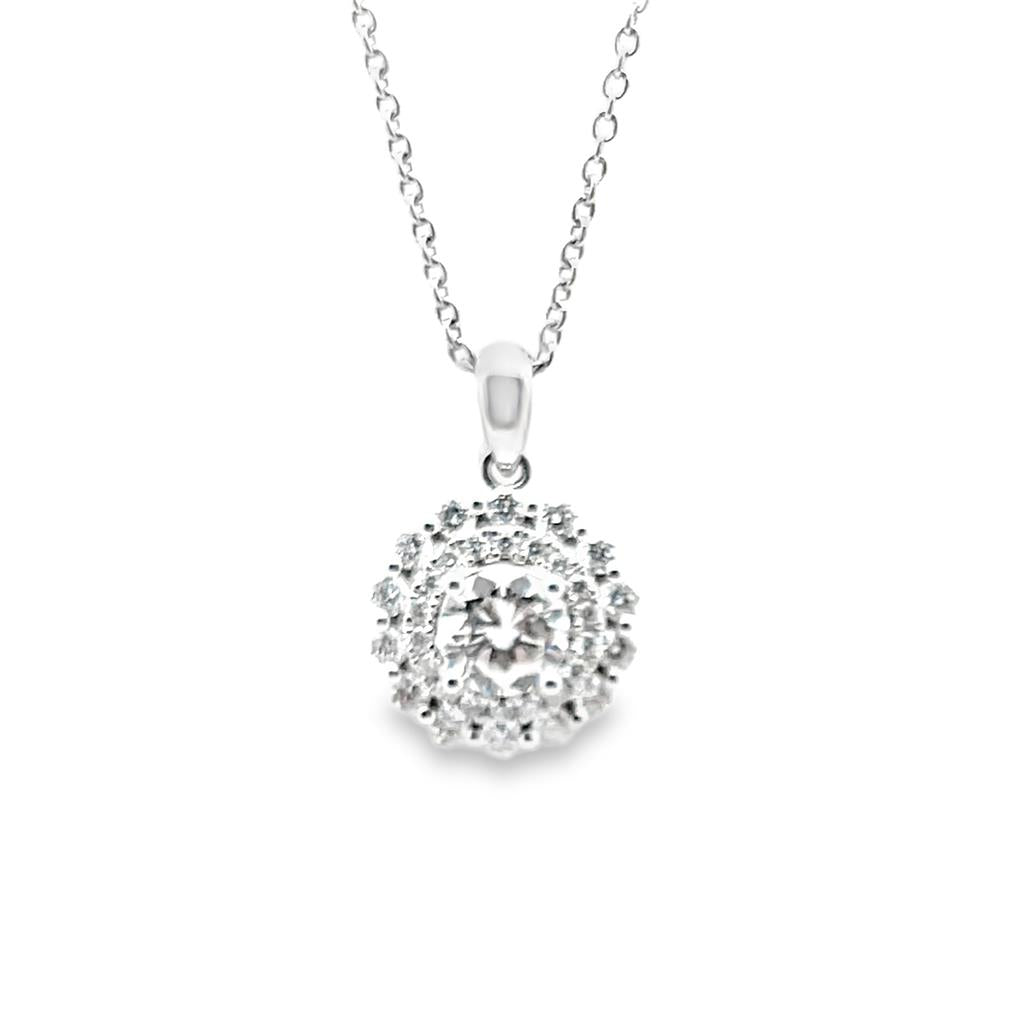 This 18kt white gold double scalloped halo diamond pendant is a stunning fusion of elegance and sparkle. At the center of the pendant is a brilliant 0.73ct round diamond, capturing the light with its exquisite cut and fiery brilliance. Surrounding the feature diamond is a double halo of 32 smaller round diamonds, totaling 0.54ct, which amplify the pendant’s radiant beauty and create a mesmerizing, multi-dimensional effect.