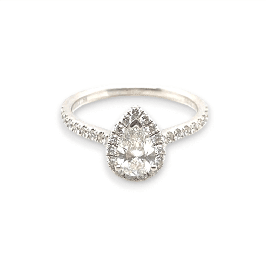 Gracefully crafted in 18kt white gold, this elegant engagement ring showcases a 0.51ct pear-shaped center diamond, G color and SI1 clarity at 10X. The centerpiece is embraced by a shimmering halo and accented band of 33 round diamonds with a combined weight of 0.35ct, adding radiant brilliance to its romantic silhouette. A refined and timeless symbol of love. Rings is a size 6.5.