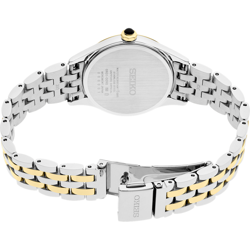 Elegant and versatile, the **Seiko Essentials Ref. SUR612** combines classic design with modern sophistication. Crafted from **two-tone stainless steel**, this refined watch features a **29.6mm case** framed by a gracefully contoured **domed bezel**, offering a polished and timeless silhouette.