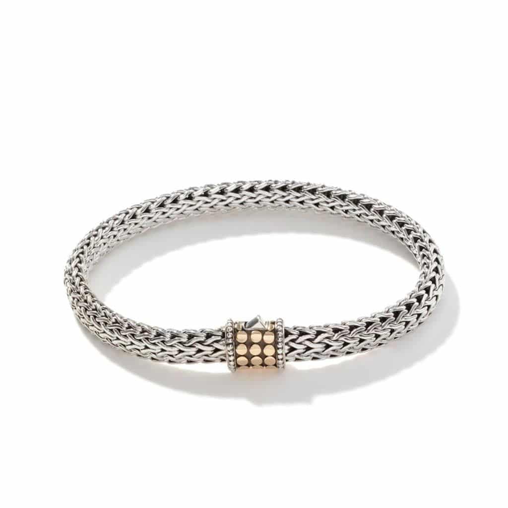 Ladies Sterling Silver and 18 KT Yellow Gold Two-Tone Dot Small Bracelet Designed By John Hardy. Bracelet is a size Medium