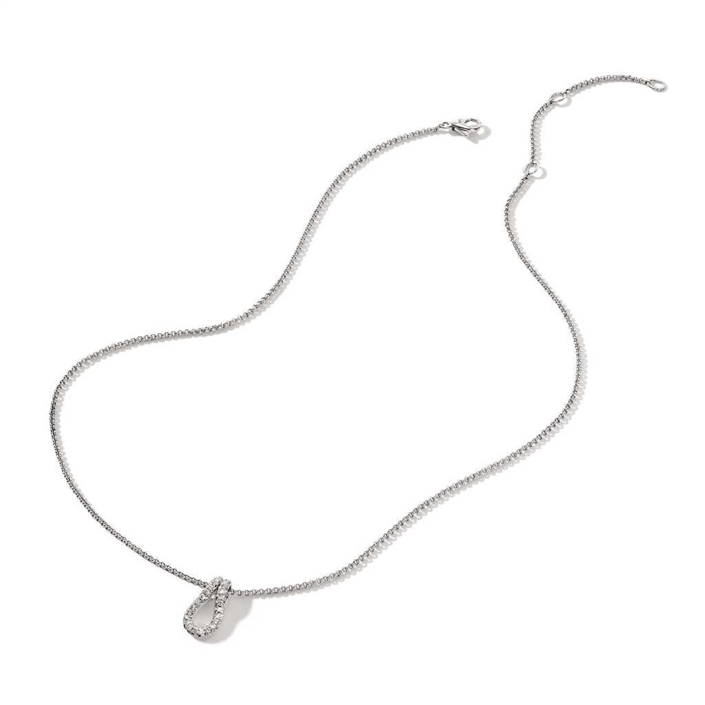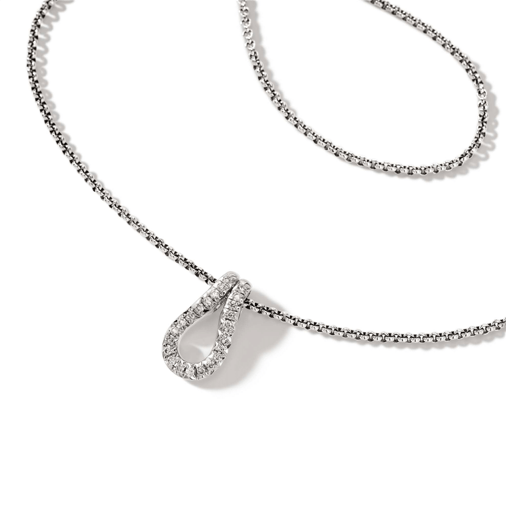 The Sterling Silver Diamond-Accented Surf Pendant Necklace by John Hardy is a sleek and contemporary piece inspired by the natural beauty of the ocean. The pendant features a surf-inspired design, accented with 24 round diamonds that add a touch of brilliance and elegance. The diamonds, with a total weight of 0.18 carats, are G/H in color (near-colorless) and SI in clarity (slightly included at 10X magnification), ensuring a radiant sparkle. Suspended on a 1.5mm sterling silver rolo chain, the necklace is adjustable in length from 16 to 18 inches, making it a versatile and stylish accessory. This necklace perfectly combines modern design with timeless craftsmanship.