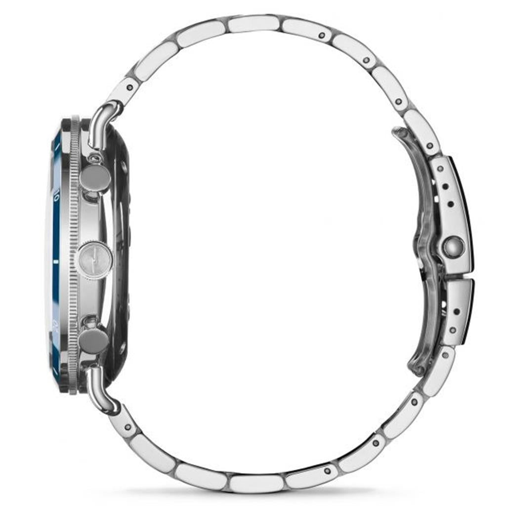 This Shinola watch features a 45mm polished stainless steel case, polished deep blue ceramic top ring insert, midnight blue dial, sapphire crystal, Argonite 5040.F quartz movement with Swiss and other imported parts, and is finished with a polished stainless steel bracelet.