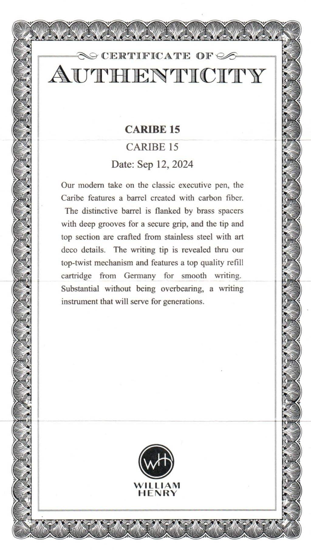 Our modern take on the classic executive pen, the Caribe features a barrel of carbon fiber. The distinctive barrel is flanked by brass spacers with deep grooves for a secure grip, and the tip and top section are crafted from stainless steel with art deco details. The writing tip is revealed thru our top-twist mechanism and features a top quality refill cartridge from Germany for smooth writing. Substantial without being overbearing, a writing instrument that will serve for generations.